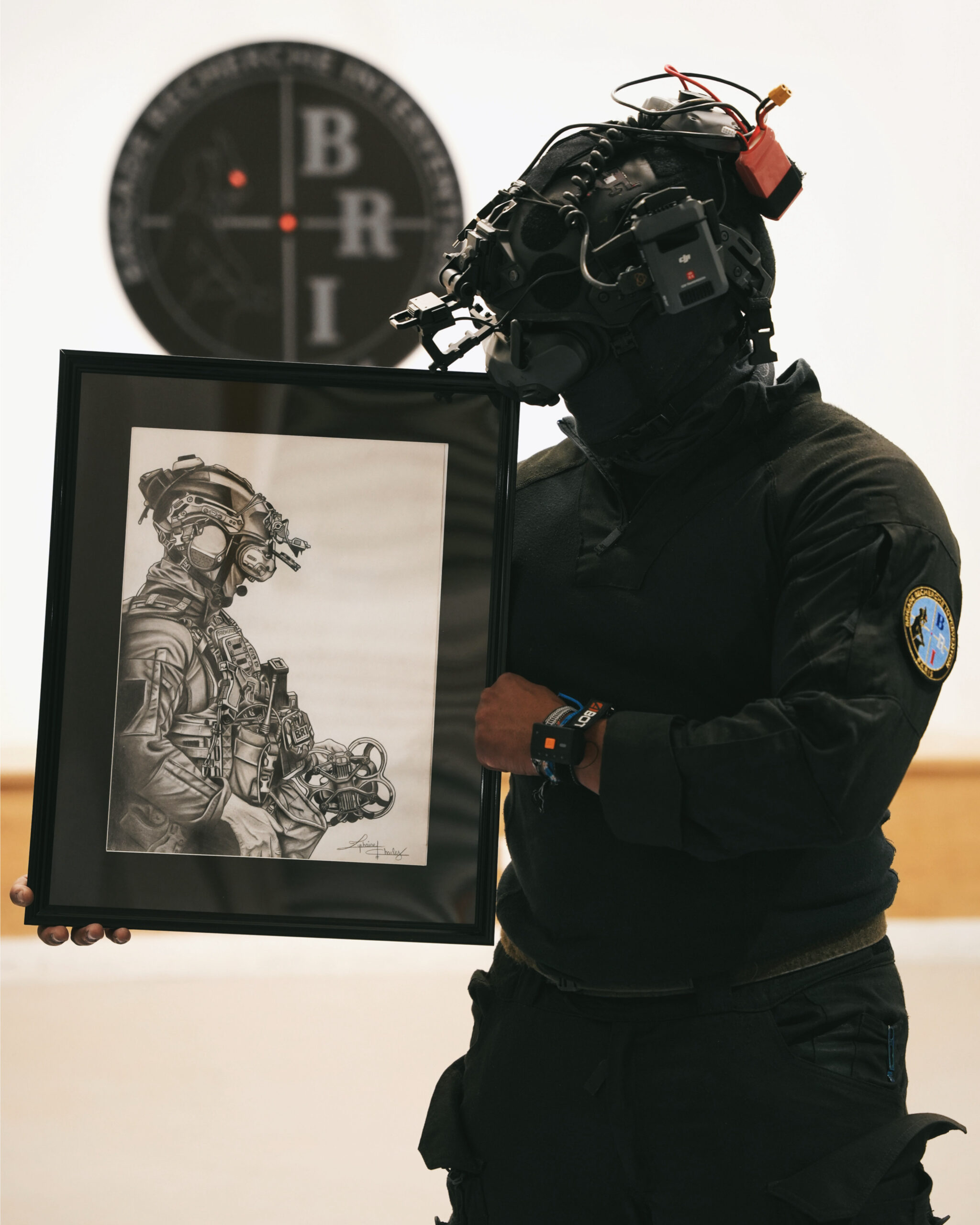 Ce dessin met en valeur un télépilote de la BRI-PP, équipé de son casque et tenant un drone tactique. Le rendu met en avant le caractère technologique et stratégique de cette spécialité, au cœur des opérations modernes.